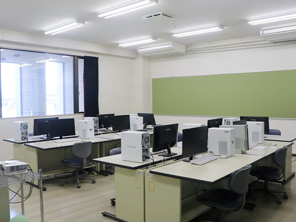 各コンピュータ教室には、映像制作・3Dグラフィックス・モデリング・アプリ開発など高度なクリエイティブワークに対応した高性能デスクトップPCを設置しています。一人一台のコンピュータを用意していますので、放課後の自習や試験対策などに使用することもできます。