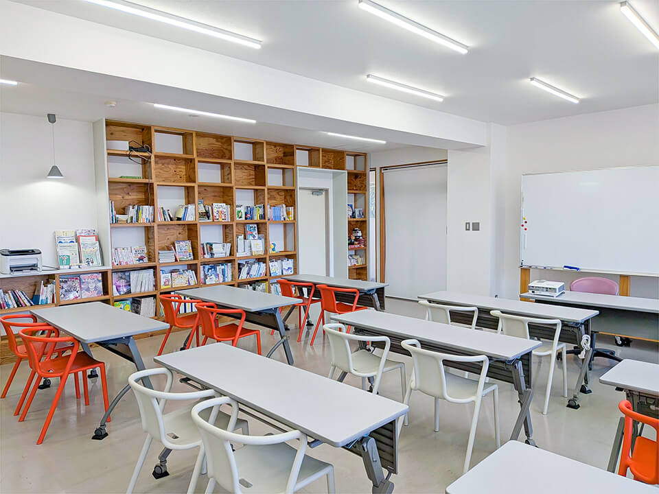 授業で使用するほか、昼食をこの部屋でとる学生も多数います。部屋の後方には給茶機(お茶、お湯、コーヒー、ココア、みそ汁)や電子レンジがあり自由に利用することができます。学校周辺にはコンビニエンスストア、ドラックストアなど、昼食を購入する場所も多く便利です。