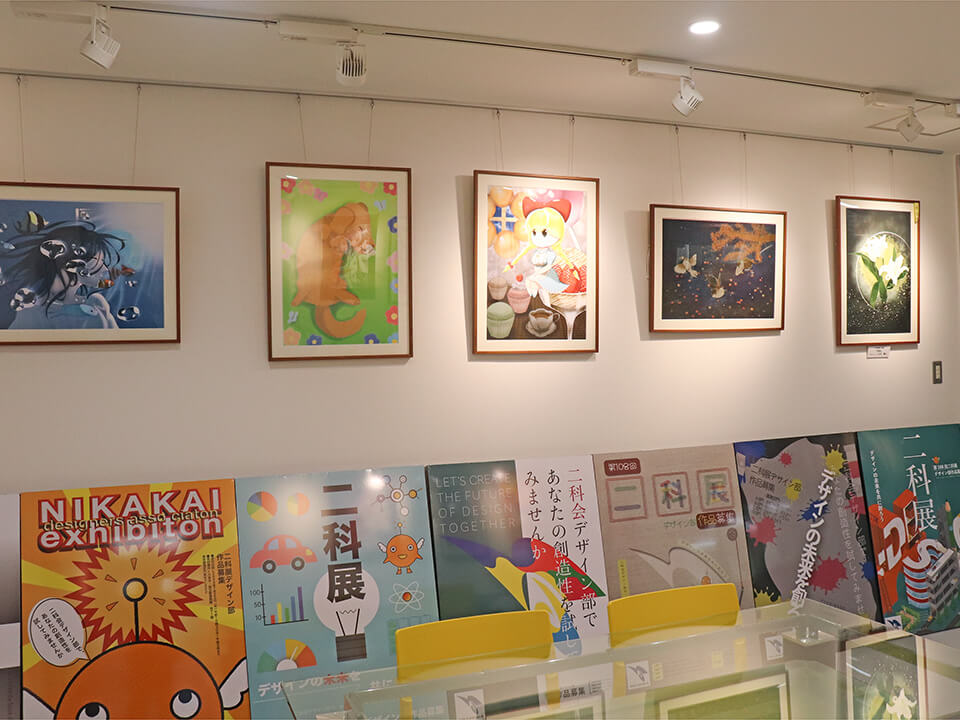 情報メディア学科デザインコースの学生作品や卒業生の作品を展示しています。本校卒業生で地元岐阜を中心に活躍されている如月れいなさんの作品も展示しています。