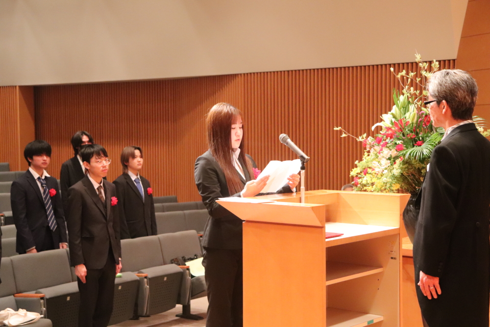 また、新入生を代表して、情報メディア学科の坂井里緒さんが入学の宣誓を行いました。